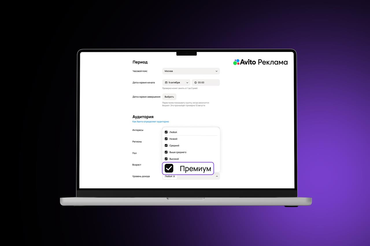 Настроить таргетинг на высокодоходную аудиторию можно в несколько кликов. Достаточно нажать на кнопку "Создать кампанию" в кабинете Авито Рекламы, определиться с типом кампании и моделью оплаты, задать сроки и бюджет, а затем выбрать характеристики "Высокий" или "Премиум" в блоке "Аудитория".