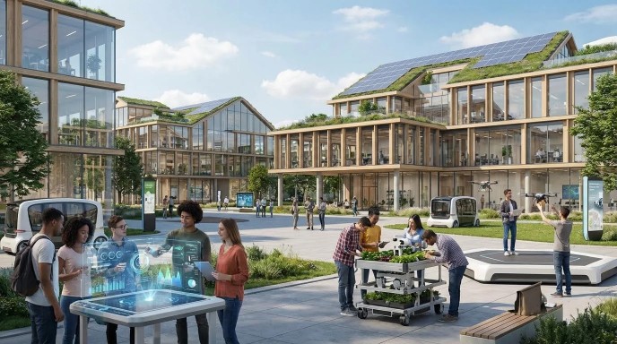 Важнейшими элементами умного кампуса становятся искусственный интеллект, интернет вещей, цифровые технологии и решения из разных отраслей, а также образовательное онлайн-пространство, применяющее лучшие подходы экосистемы Госуслуг, маркетплейсов и классифайдов. Современный кампус — это высокотехнологичный архитектурный комплекс, который включает образовательные корпуса, общежития, места для творчества и спорта, рекреационные зоны, прилегающую смарт-инфраструктуру.