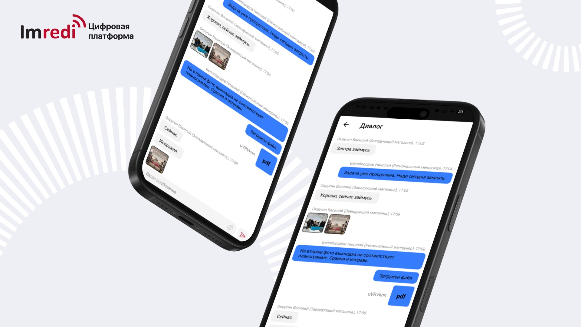 Цифровая платформа Imredi позволяет оцифровать все задачи и обмен информацией с магазинами, организовать их проверки и фотоконтроль, работать с товарами, собирать и анализировать данные из точек продаж, предоставляя единое рабочее место в мобильном приложении. Каждый день на платформе Imredi работают более 70 тыс. пользователей крупнейших розничных сетей.